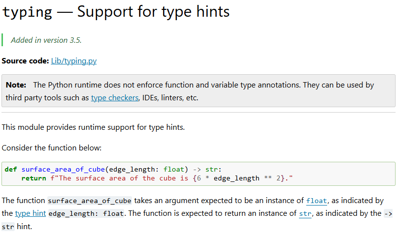 파이썬 커뮤니티는 이러한 동적 타이핑의 한계를 인식하고, 언어의 핵심 철학을 해치지 않으면서도 안정성과 유지보수성을 확보할 수 있는 방안을 모색했다. 그 결과, 2015년 파이썬 3.5와 함께 PEP 484가 공식적으로 채택되면서 typing 라이브러리가 표준 라이브러리의 일부로 포함되었다. 이 사건은 파이썬의 역사에서 매우 중요한 전환점이었다. 타입 힌트(Type Hints)는 개발자가 변수, 함수 매개변수, 반환 값 등에 예상되는 데이터 타입을 주석처럼 명시할 수 있는 기능을 제공하며, 정적 타입의 이점을 파이썬에 도입하는 문을 열었다.
